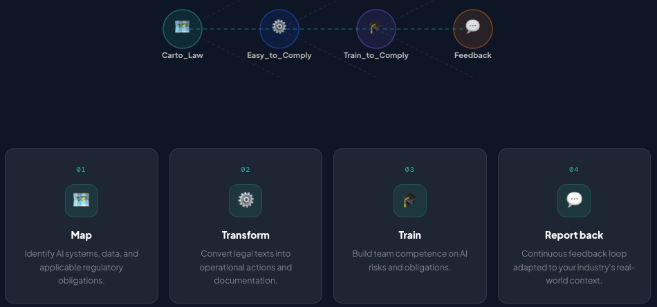 Four interdependent modules to map, transform, train and report back on your compliance.