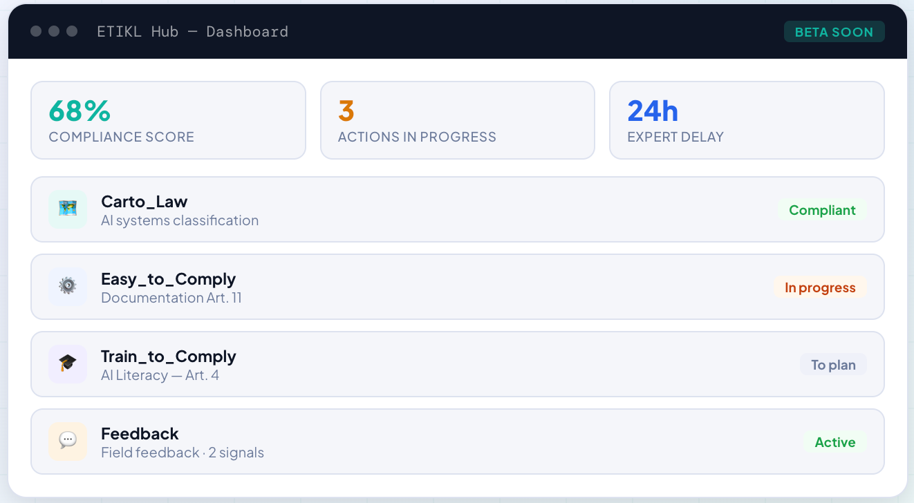 A preview of the future ETIKL Hub — simple, structured, actionable.